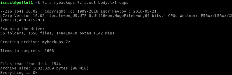7z pode compactar arquivos e pastas. Usaremos um comando para criar um novo arquivo. O novo nome do arquivo será mybackup.7z e colocaremos os arquivos a.out, body.txt e folder cups. Aqui o