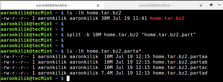 $ split -b 10M home.tar.bz2 "home.tar.bz2.part"